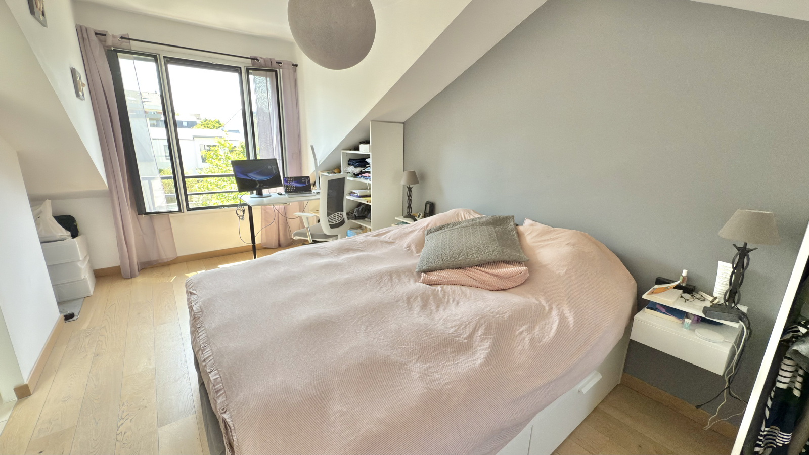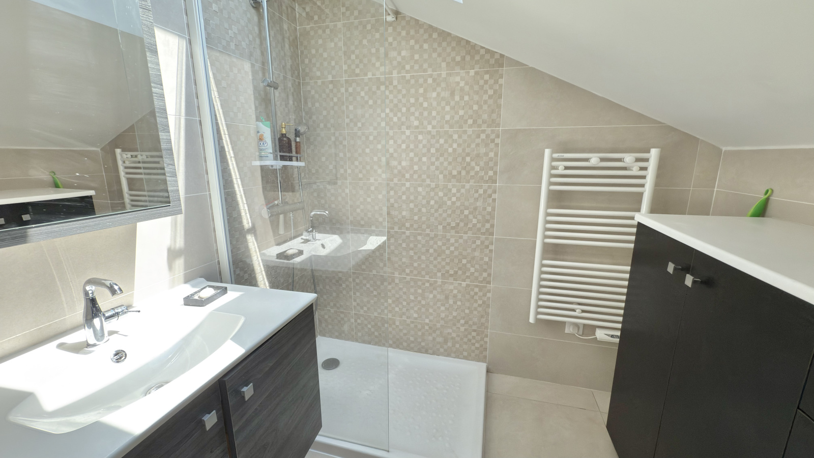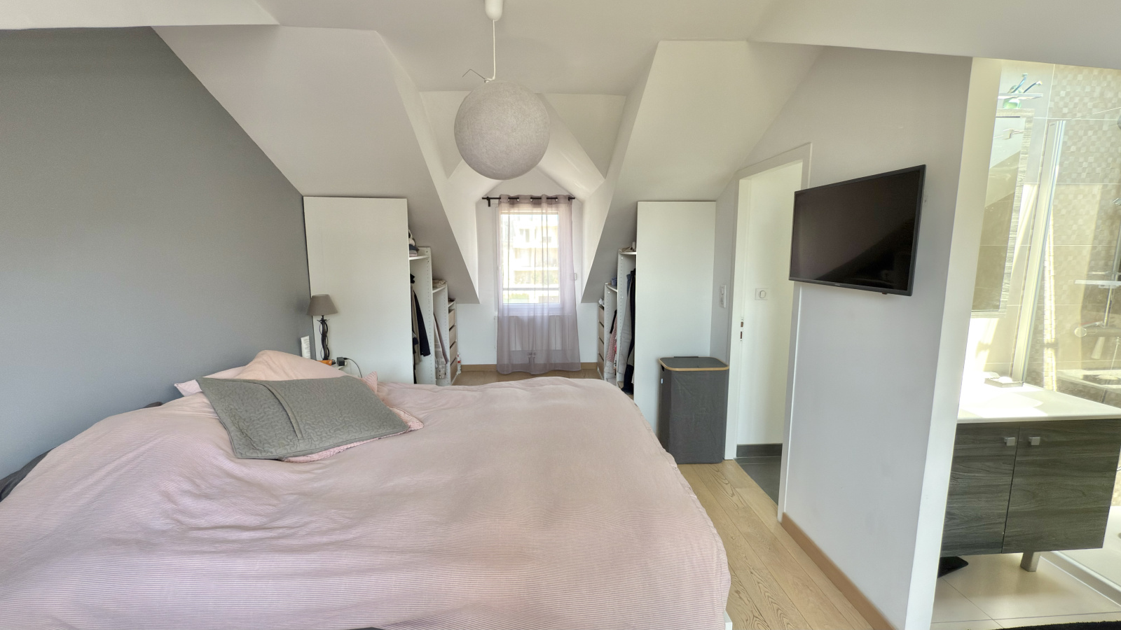 Côté nuit, deux chambres se trouvent au même niveau que la pièce de vie, avec une salle d'eau moderne et des WC indépendants. A l'étage supérieur, sous combles, se trouve la suite parentale avec son dressing, sa salle de douche et ses WC séparés ainsi que de nombreux rangements.