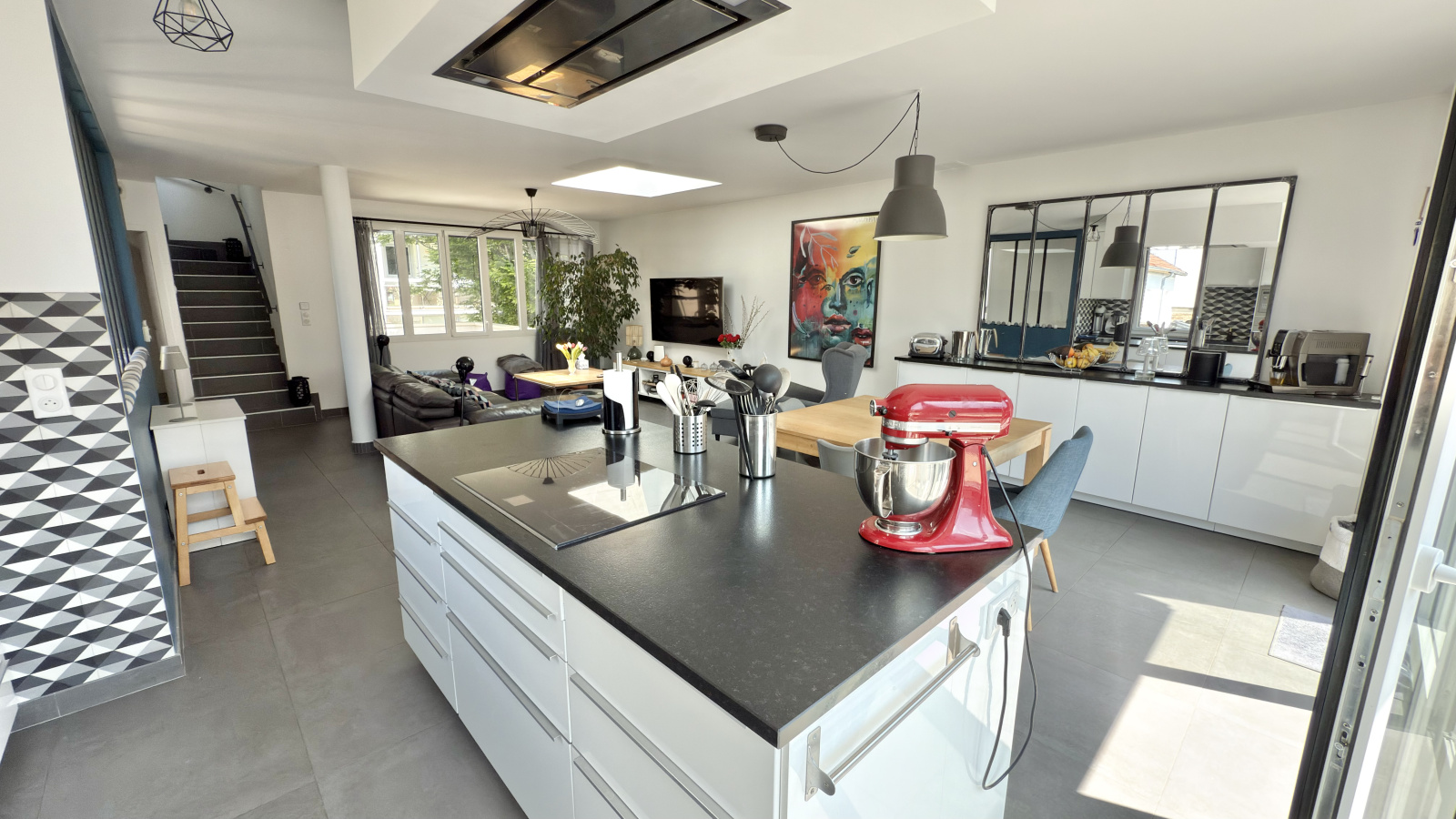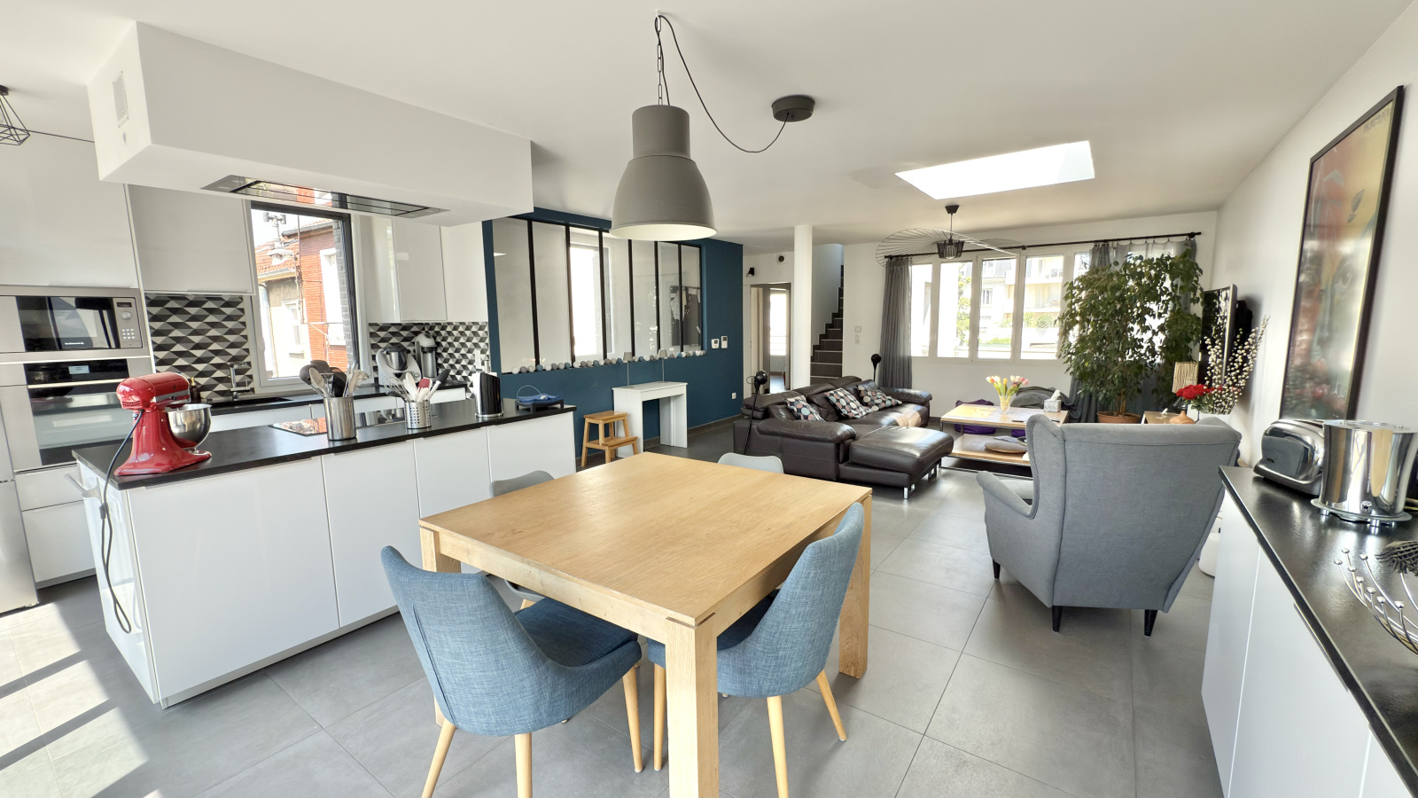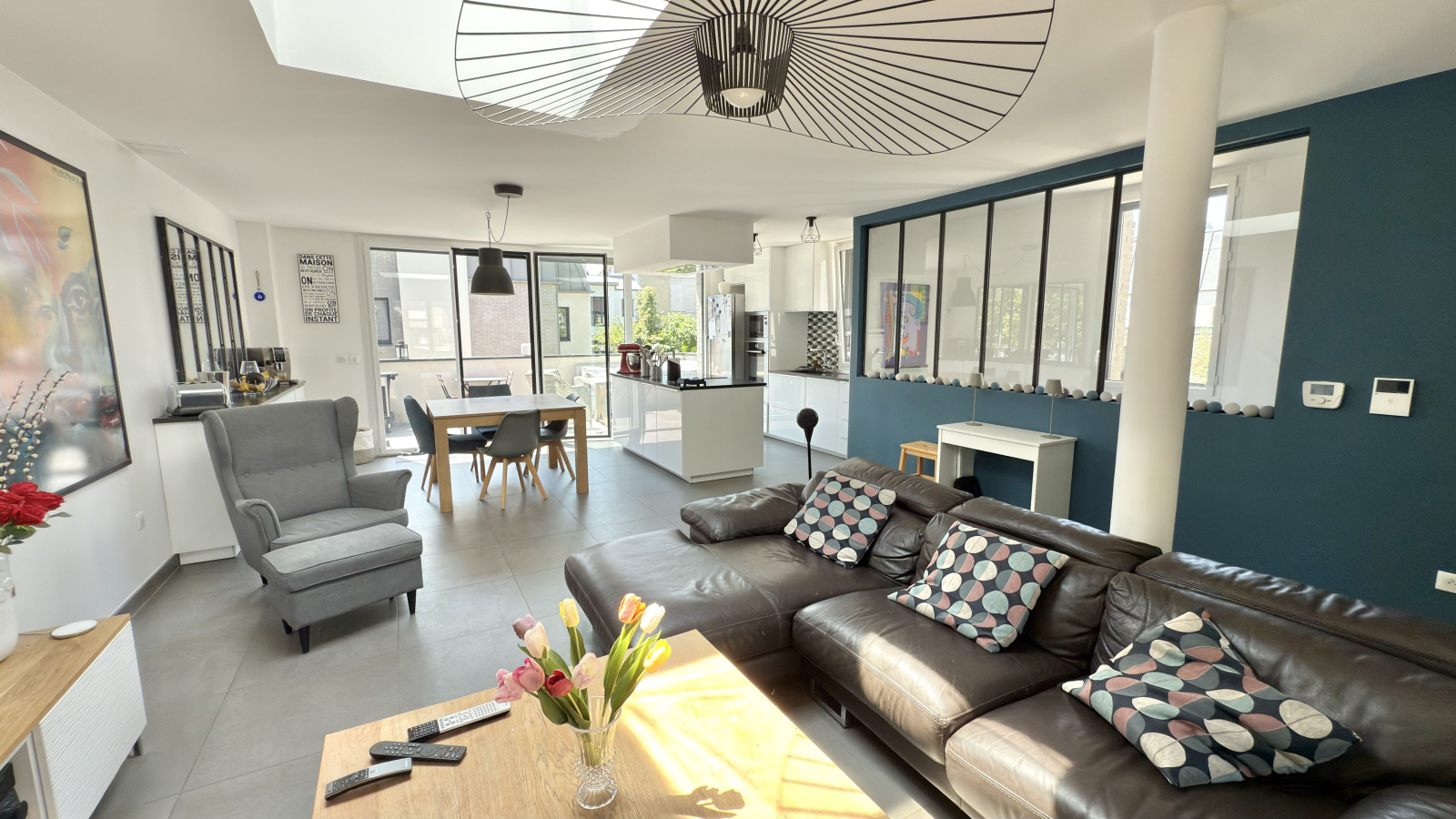 Baignée de lumière grâce à sa triple exposition et ses grandes ouvertures, cette maison séduit immédiatement par ses volumes et son atmosphère chaleureuse.