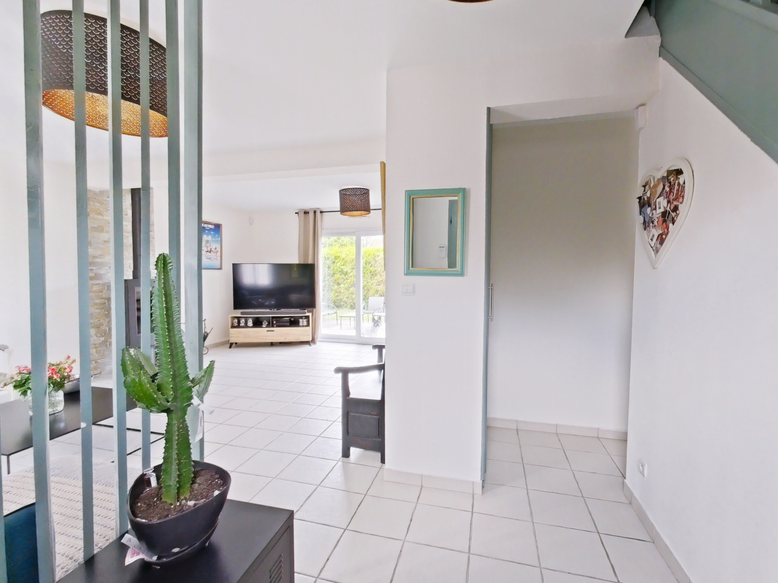 Passez la porte, une entrée avec placards vous donne accès à un espace de vie lumineux de plus de 38m2 équipé d'un poêle à bois donnant directement sur le jardin et la terrasse de 40m² exposés Sud-Ouest.