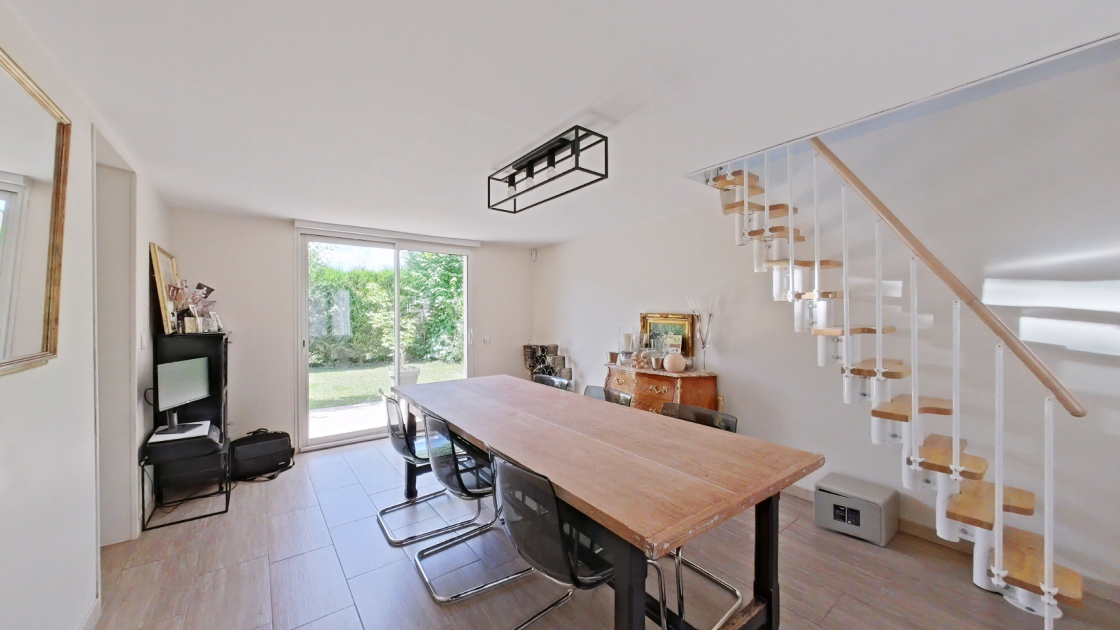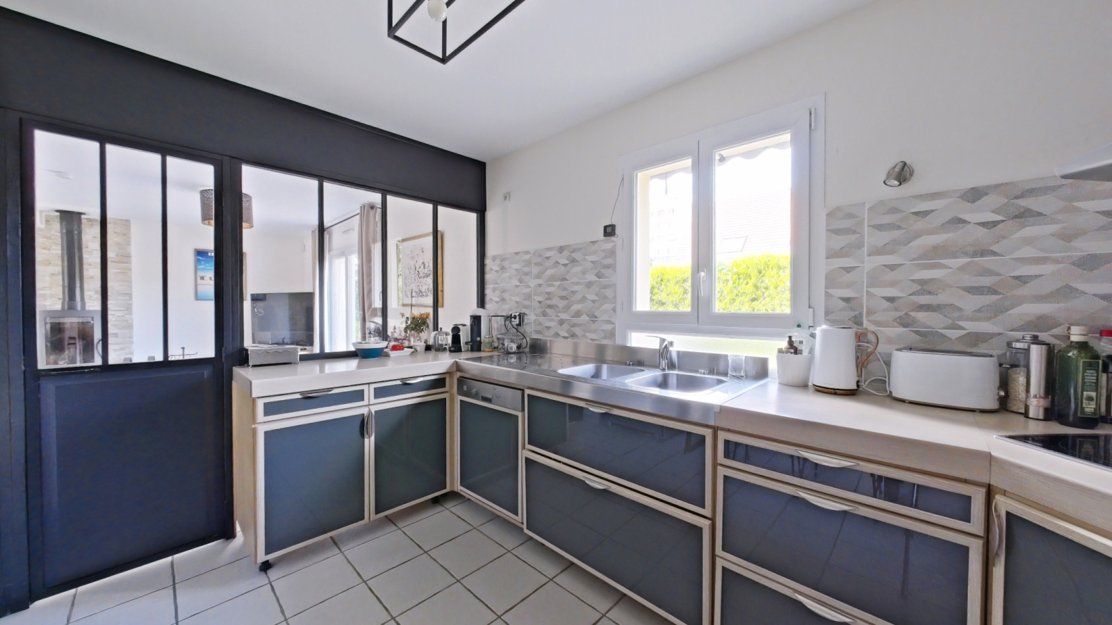 La cuisine fonctionnelle et moderne avec verrière restera aménagée et équipée et donne accès à une salle à manger (possibilité de 6ème chambre) et une mezzanine offrant un espace nuit supplémentaire.