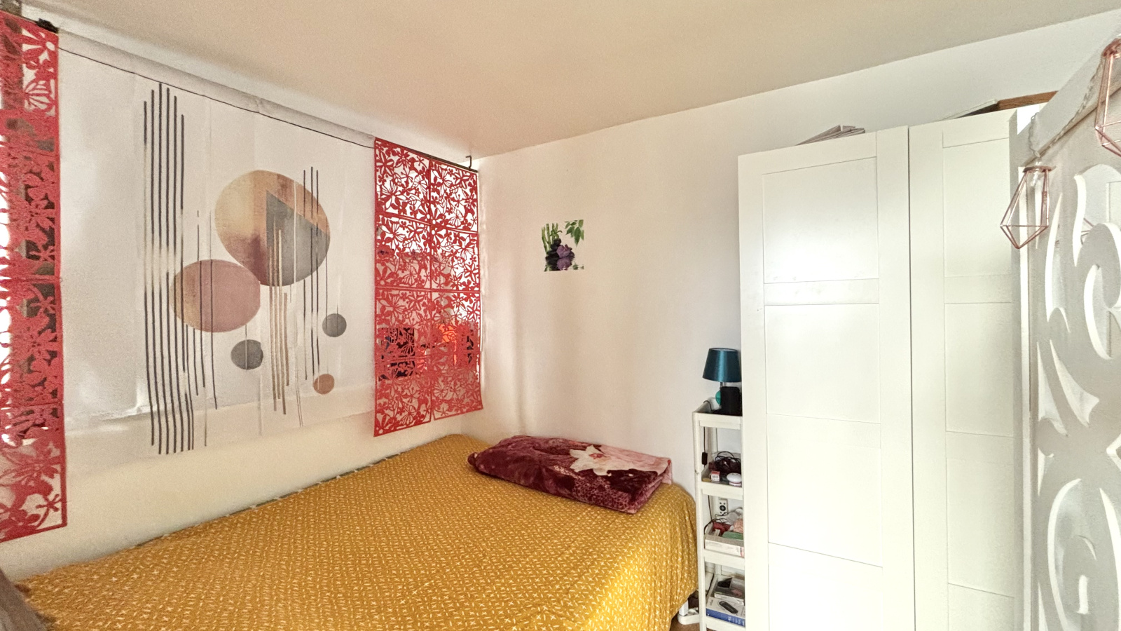L'appartement est actuellement configuré en F3 avec un espace nuit qui coupe la partie séjour en deux. Ce coin nuit peut être retiré très simplement. Dans le dégagement qui mène à la chambre de 12m² avec balcon, se trouvent un toilette, un cellier et une salle d'eau.