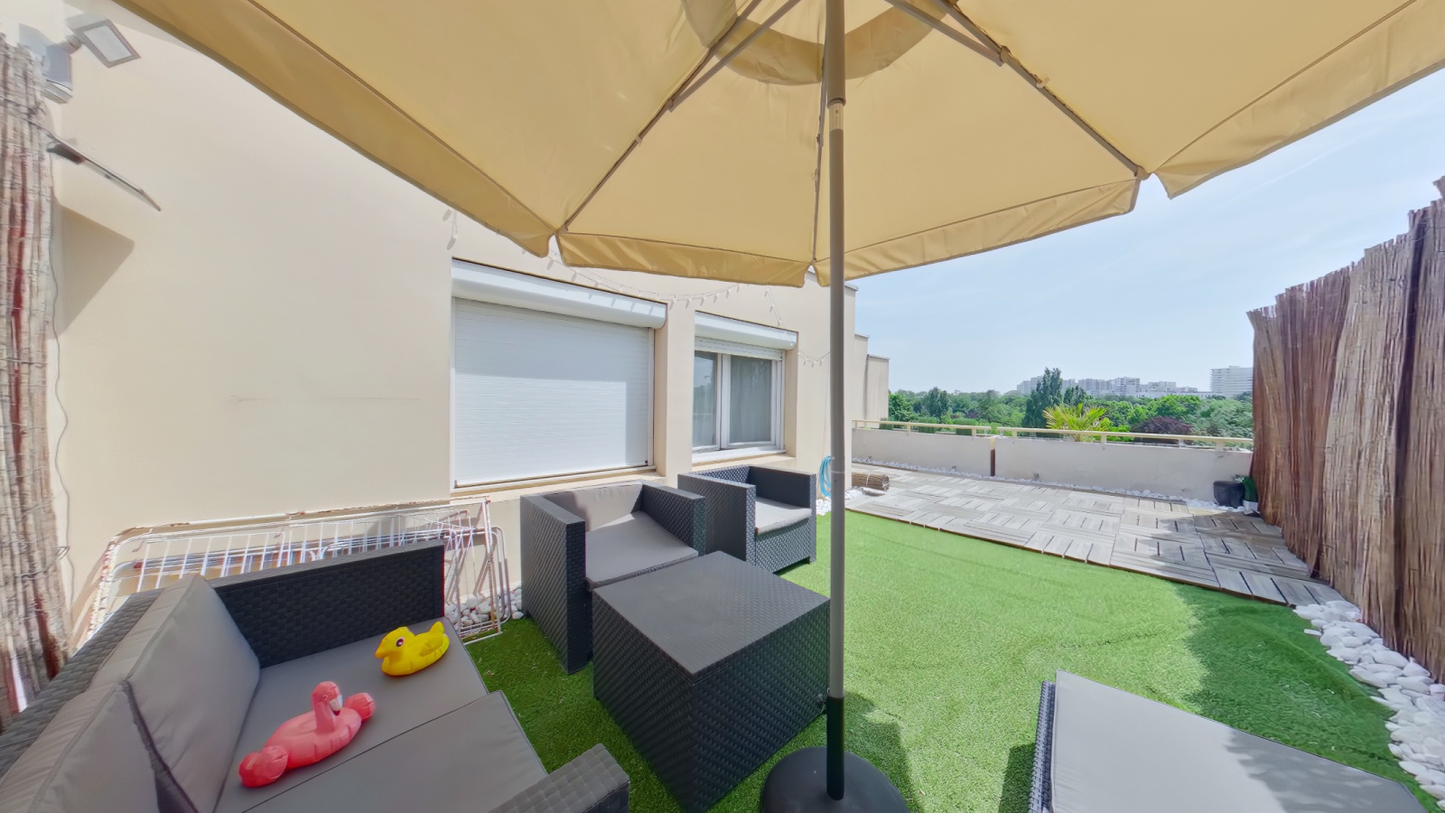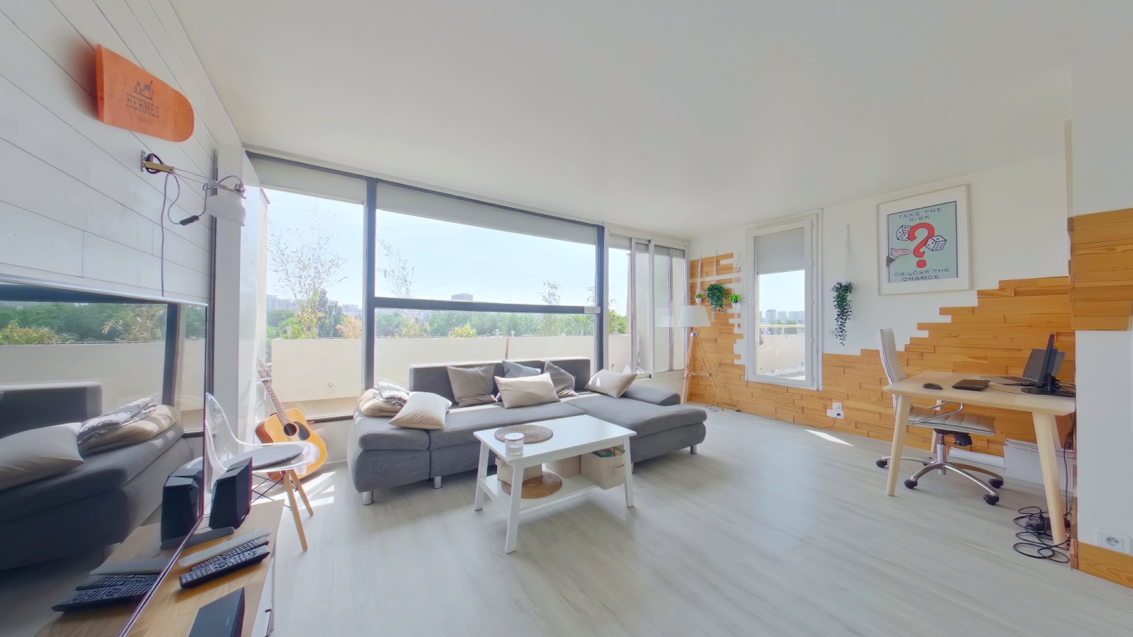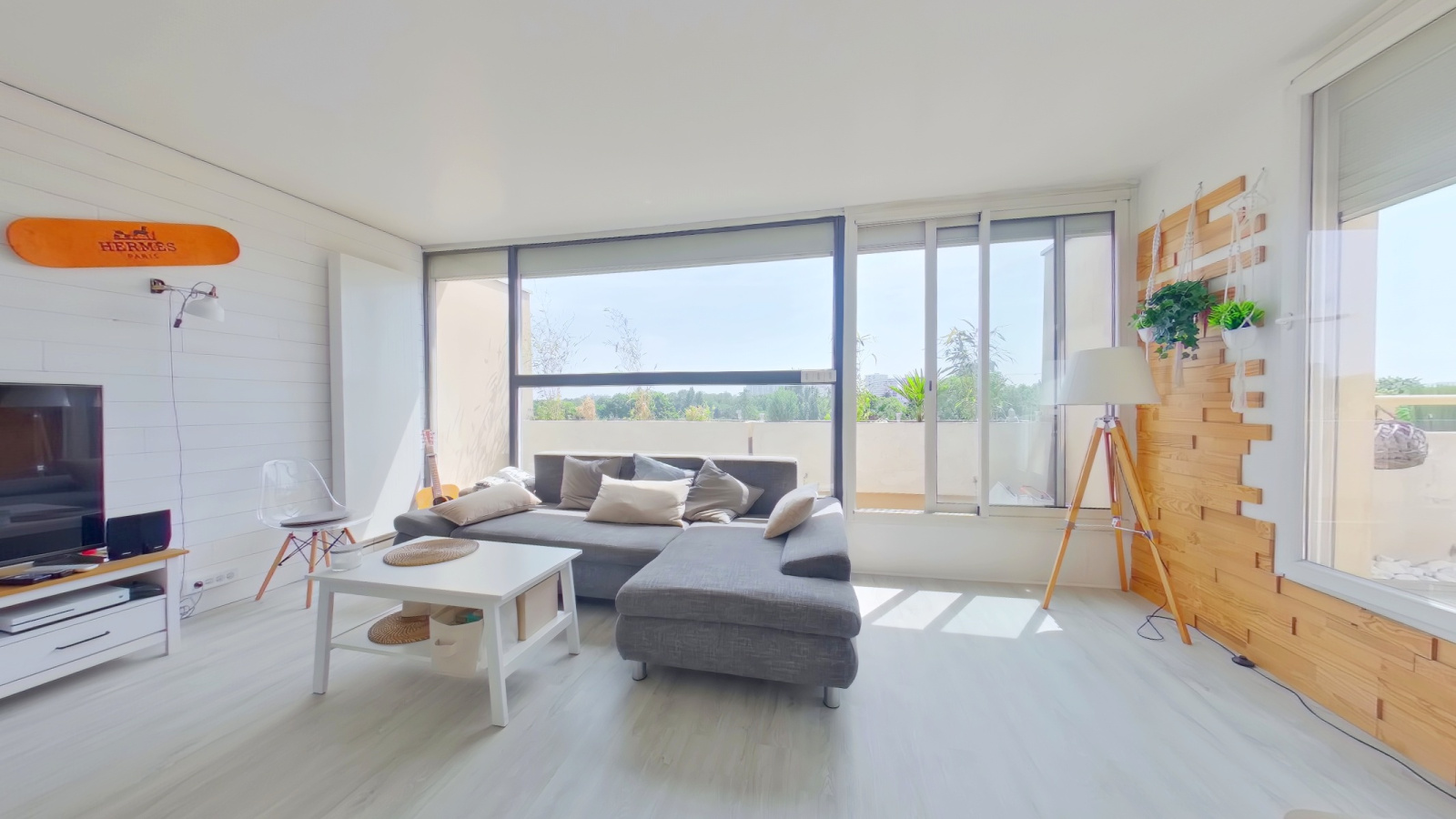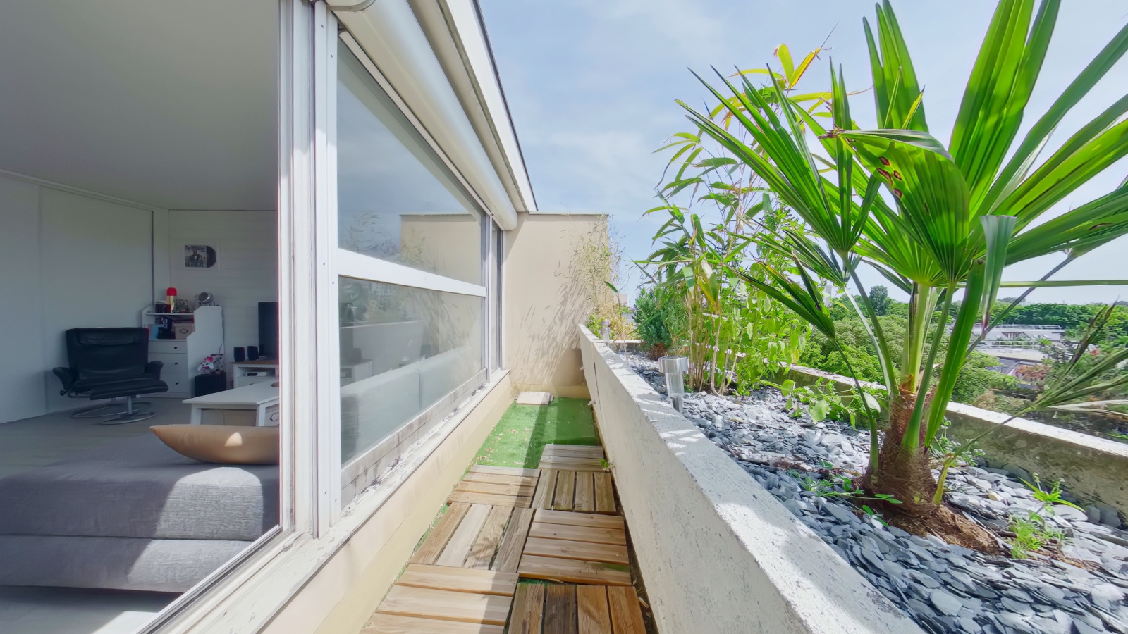 Pièce maitresse de ce F2, le salon est baigné de soleil par ses grandes baies vitrées et s’ouvre à la fois sur un balcon de 3m² avec jardinières intégrées et sur une terrasse de 30m² exposée sud ouest avec une belle vue dégagée.
