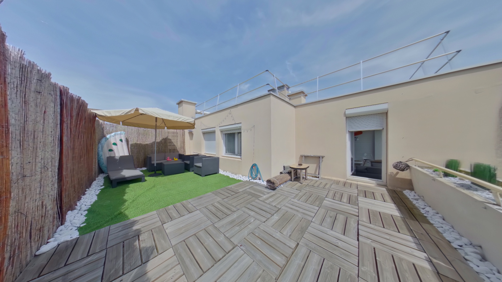 L’entrée distribue une chambre avec dressing, une salle d’eau avec toilette, la cuisine aménagée et équipée avec sa fenêtre qui donne sur la terrasse et enfin un beau séjour de 24m².