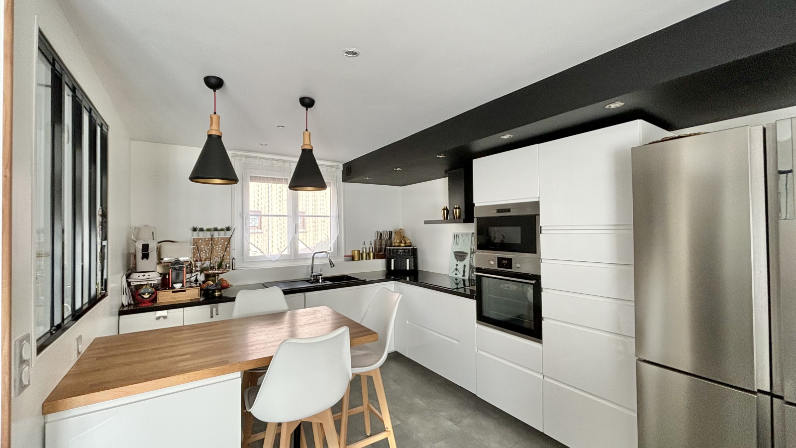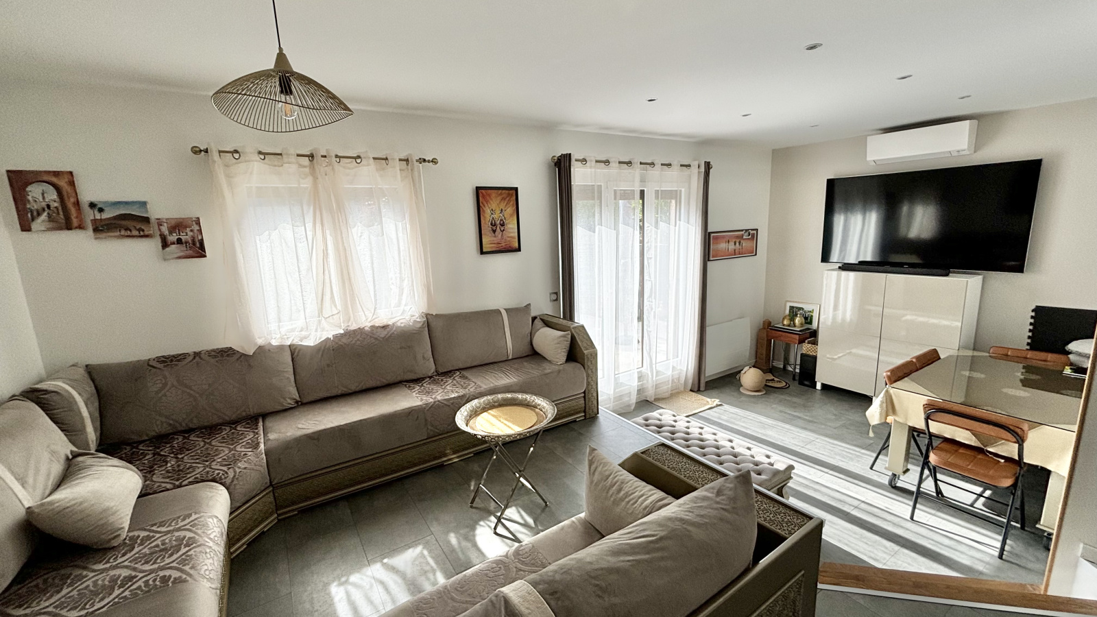 Double vitrage et volets électrique, électricité refaite, parquet et peinture il y a moins de 3 ans. La maison, mitoyenne d'un coté, fait partie d'une petite copropriété composée de 15 lots.Les charges mensuelles s'élèvent à 110€ et comprennent l'eau et l'entretien des parties communes (espaces verts, sous-sol, etc.).