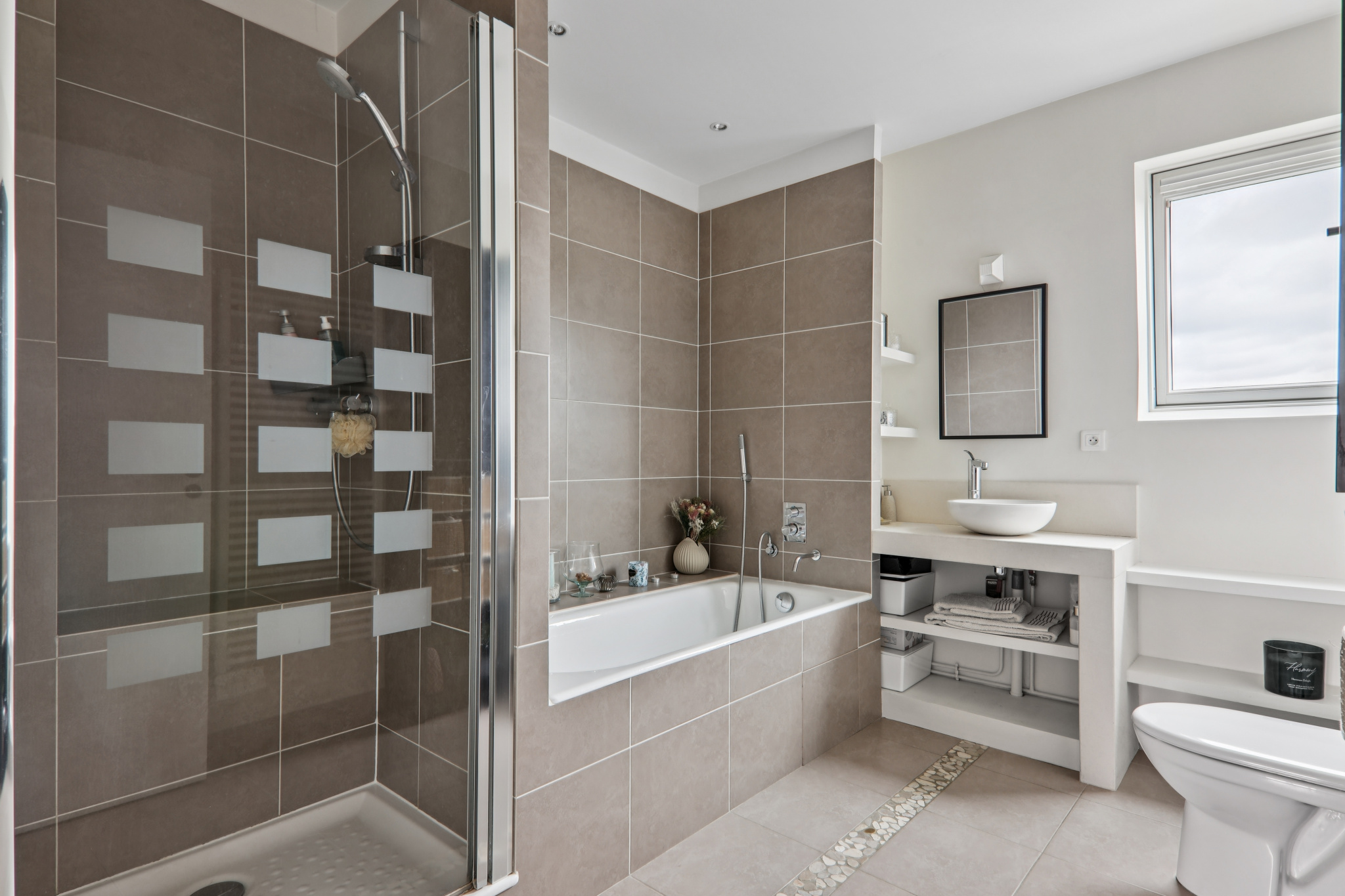 L’espace nuit se compose de deux grandes chambres lumineuses de 15 et 18 m², dotées de rangements intégrés, avec la possibilité d’aménager une troisième chambre selon vos besoins. Une salle d’eau confortable avec douche, baignoire et WC complète ce niveau.