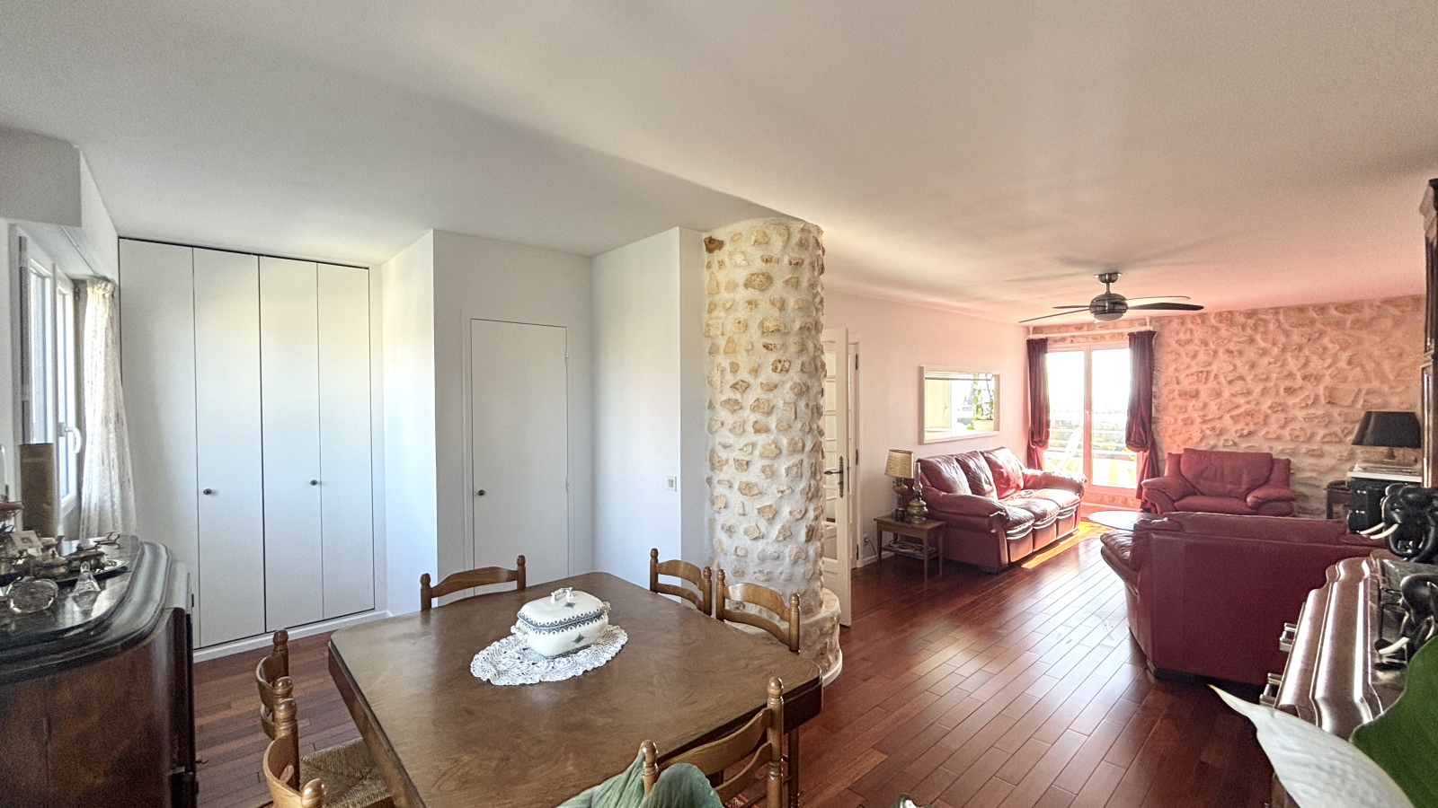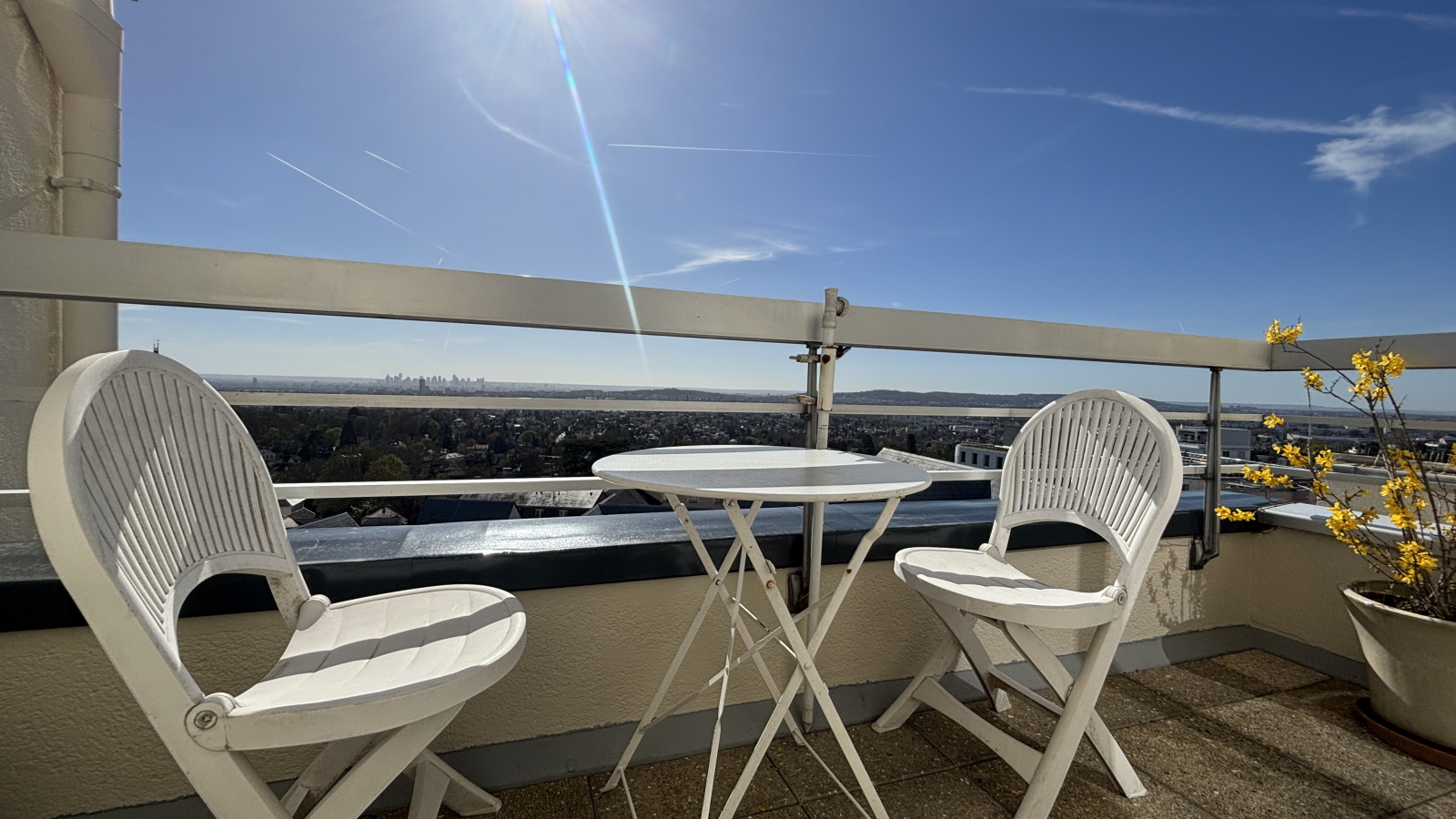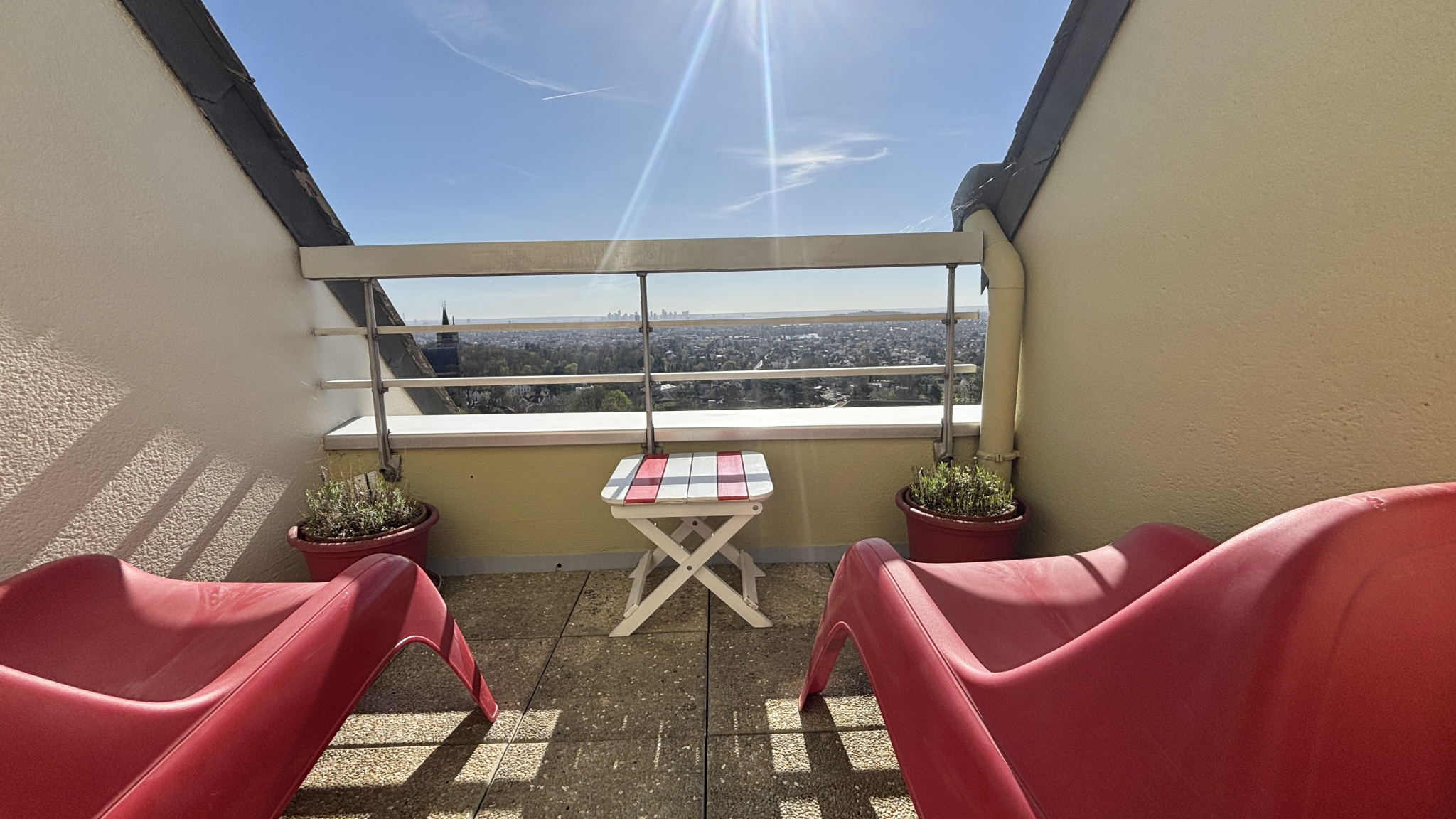 Situé au 5ème et dernier étage avec ascenseur d'une résidence de 1987 ravalée en 2025, ce duplex de 82m² (90m² au sol) se compose d’une entrée avec placard, une cuisine aménagée et équipée ouverte sur le séjour traversant de 32m² s'ouvrant de part et d'autre sur des terrasses dont l'une exposée sud-ouest avec une vue panoramique sur Paris et la collégiale de Montmorency.