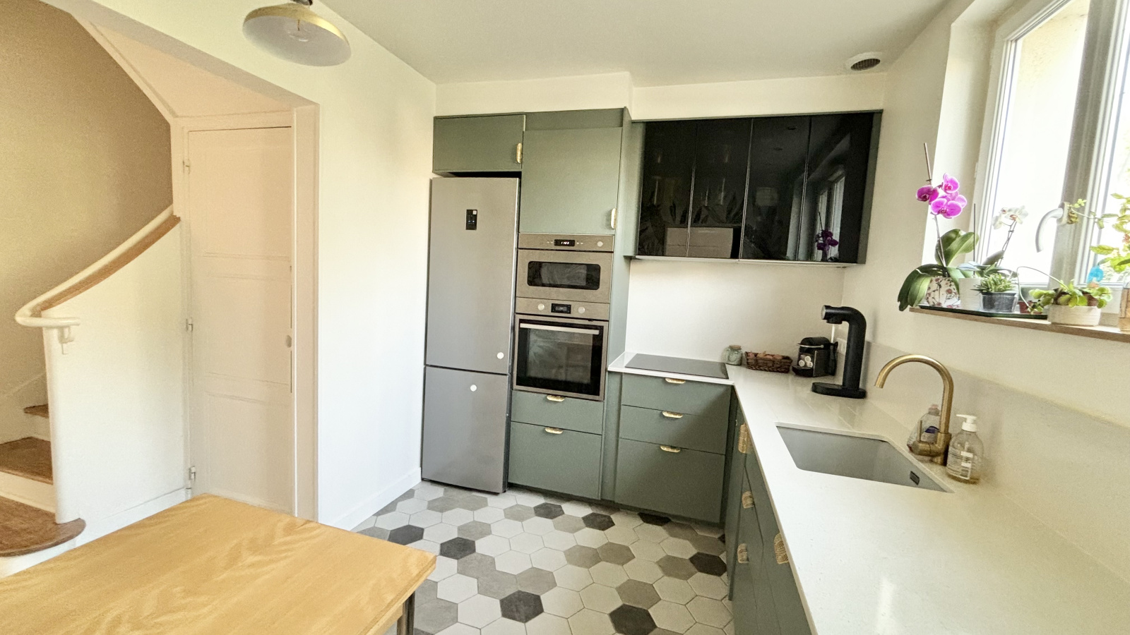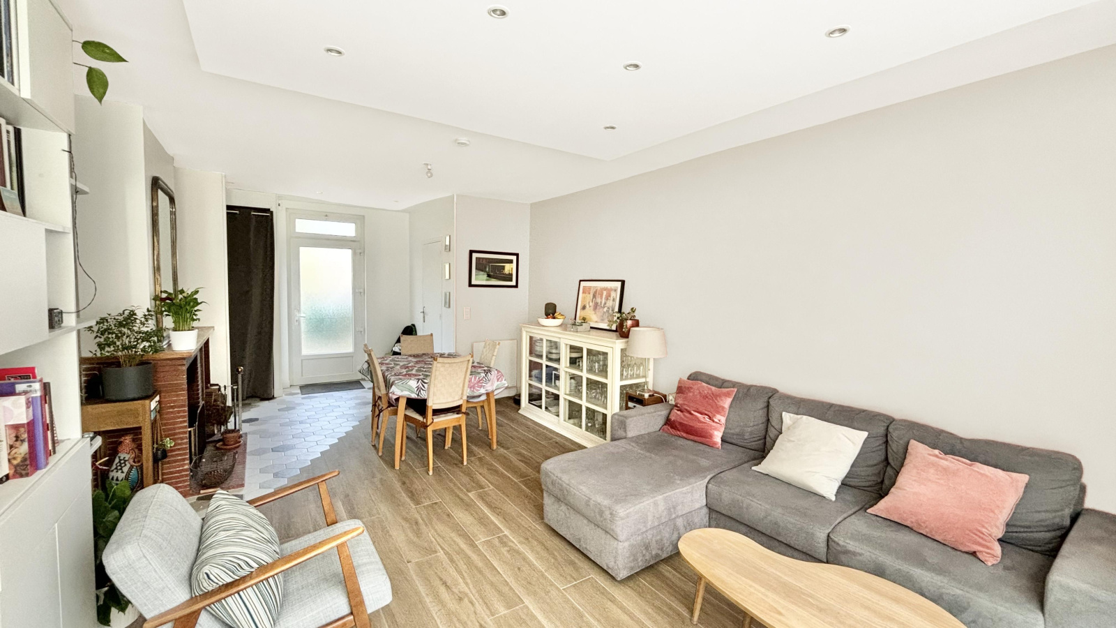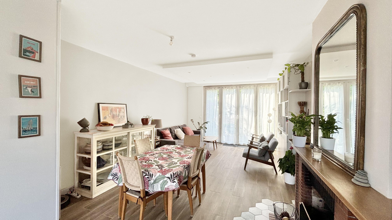 Cette jolie maison à la décoration soignée se compose d'une entrée avec placard desservant une pièce à vivre de 30m² avec une cuisine dinatoire qui restera aménagée et équipée.