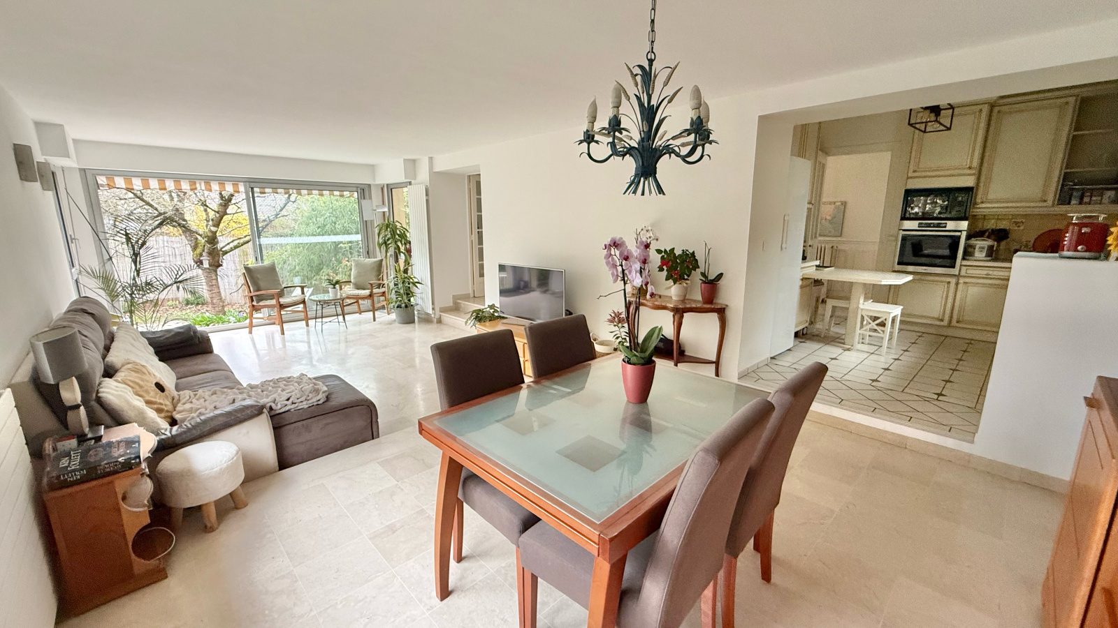 Dès l'entrée, le charme opère avec un salon d'hiver chaleureux doté d’une cheminée, d’un parquet en chêne massif et d’une bibliothèque sur mesure de style Louis XVI. La cuisine amémanée et équipée semi-ouverte s'ouvre sur un vaste séjour, baigné de lumière grâce à ses nombreuses ouvertures, et donne sur une terrasse et un jardin exposés plein sud.