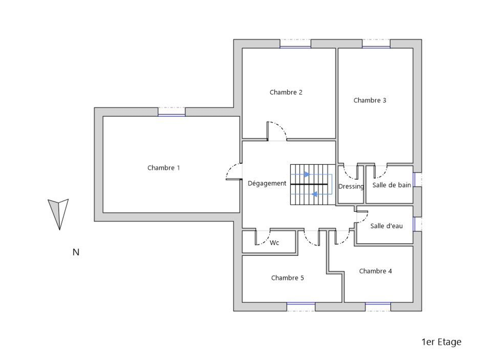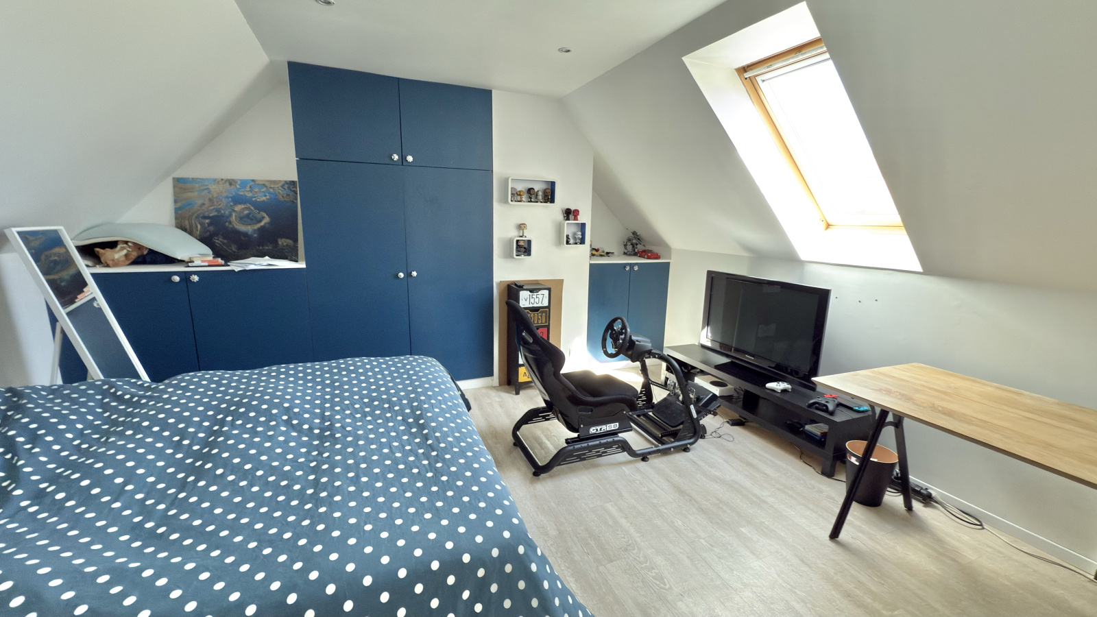 À l’étage, un large palier distribue une suite parentale avec dressing et salle de bains, quatre chambres dotées de rangements intégrés, une salle d’eau moderne et des toilettes indépendantes. Chaque espace a été conçu pour répondre aux besoins d’une vie de famille, entre confort et praticité.