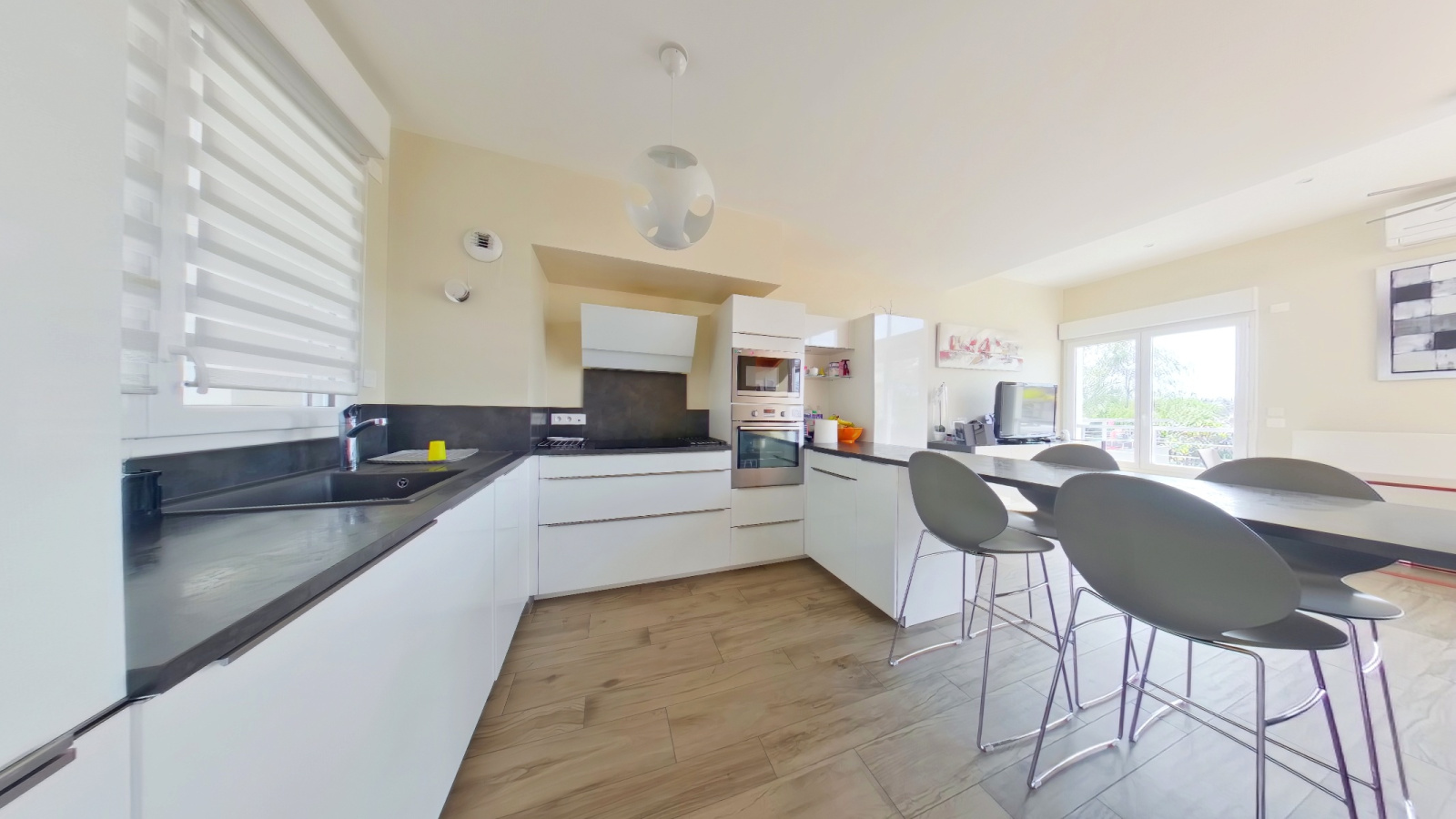 La cuisine ouverte sur le séjour avec plafond cathédrale, est entièrement équipée et dispose d'un îlot central pour les moments conviviaux. Une magnifique terrasse végétalisée de 20m² exposée sud, sans vis-à-vis, vous attend pour les déjeuners à l'ombre du store. Une suite parentale avec sa salle d'eau attenante s'ouvre également sur la terrasse.
