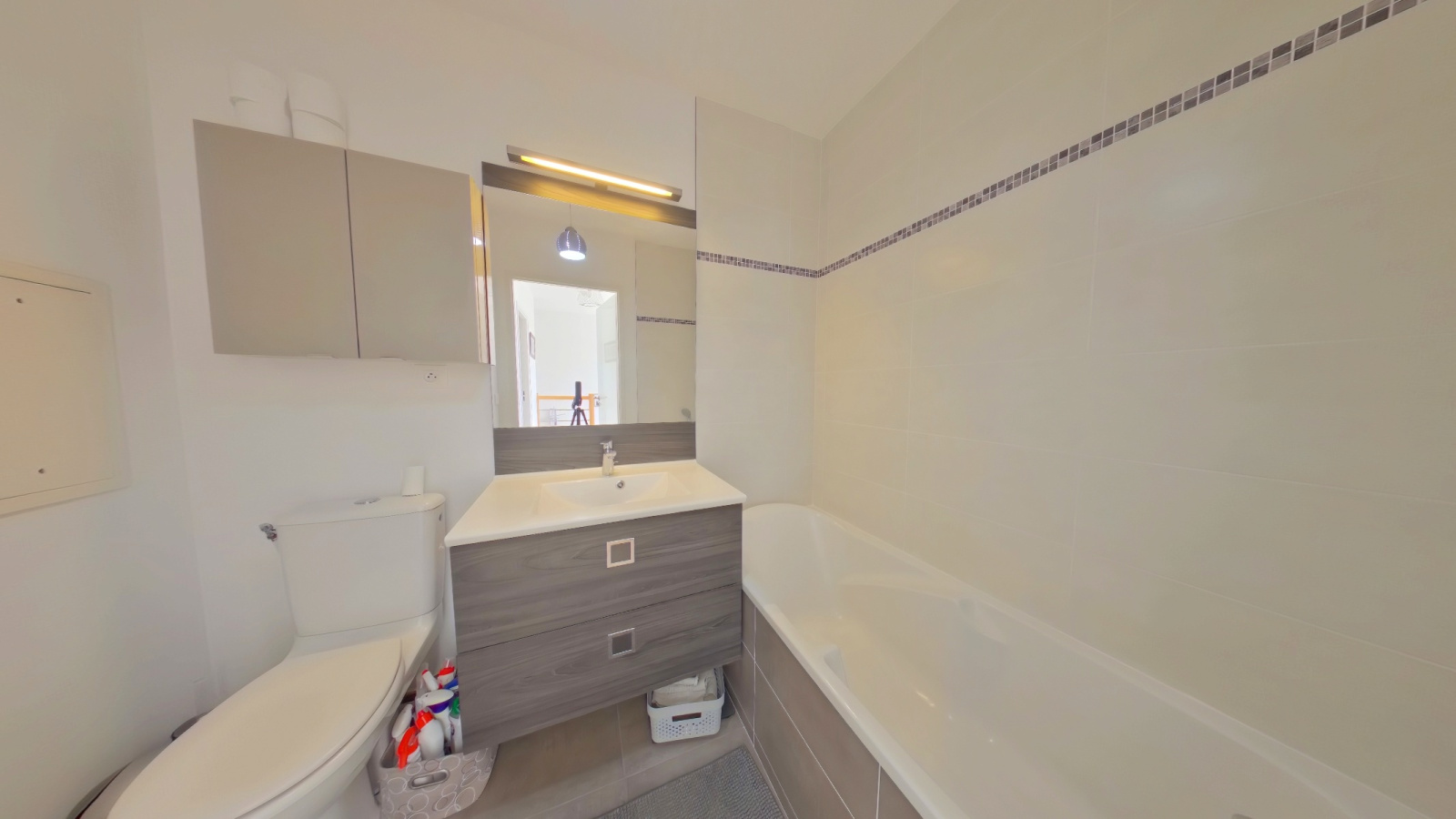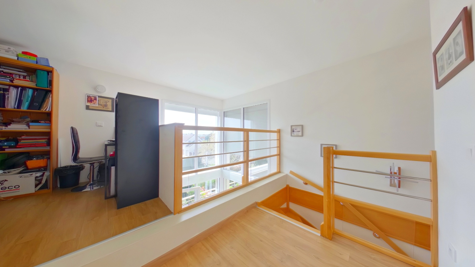 Des toilettes indépendantes avec lave-main complètent ce niveau. L'escalier aérien mène au plateau mezzanine qui donne sur le séjour, il sert actuellement de coin bureau. L'espace nuit se poursuit à l'étage et se compose de deux chambres de 10 et 11m² dont une équipée d'un placard et une salle de bain avec toilettes.